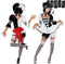 Dit harlekijn kostuum is niet alleen leuk, maar ook praktisch. Het overhemd heeft een zwart-witte kleurstelling met geblokte motieven en een elastische taille voor extra comfort. De bijpassende korte broek is versierd met schattige strikjes en heeft ook een elastische taille. De muts met vier punten en belletjes voegt een speelse touch toe, terwijl de halsketting het geheel compleet maakt. Dit kostuum is ideaal voor lange feestnachten, zodat je je vrij kunt bewegen en volop kunt genieten.